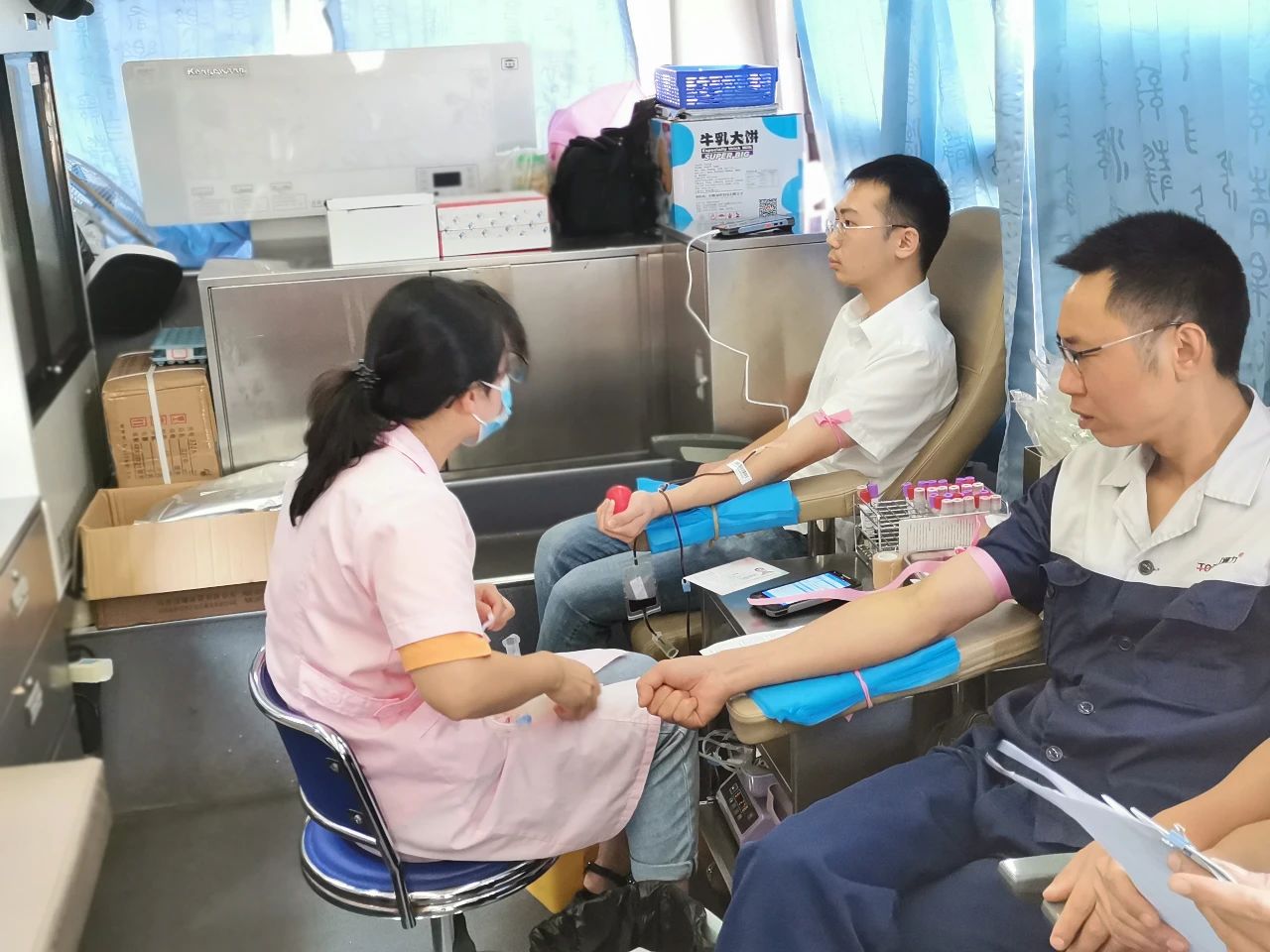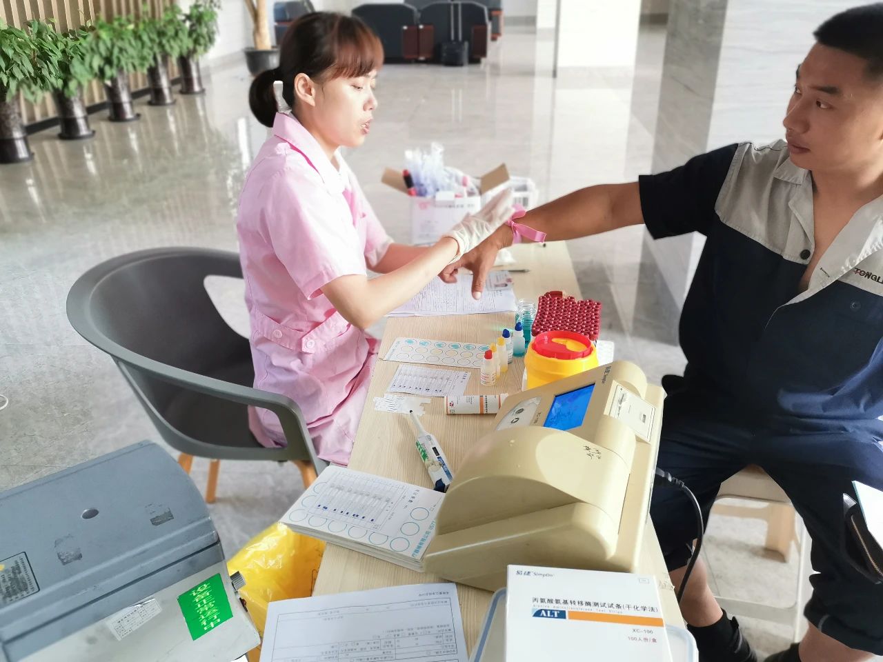 当日一早,在办公楼大厅已是人头攒动,二十多名威廉希尔williamhill员工们排起了长队,在医护人员的解说下逐个填写献血登记表,而后是抽血、验血步骤,验血合格后进行最终的献血。